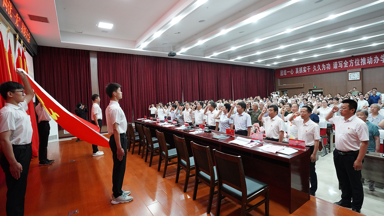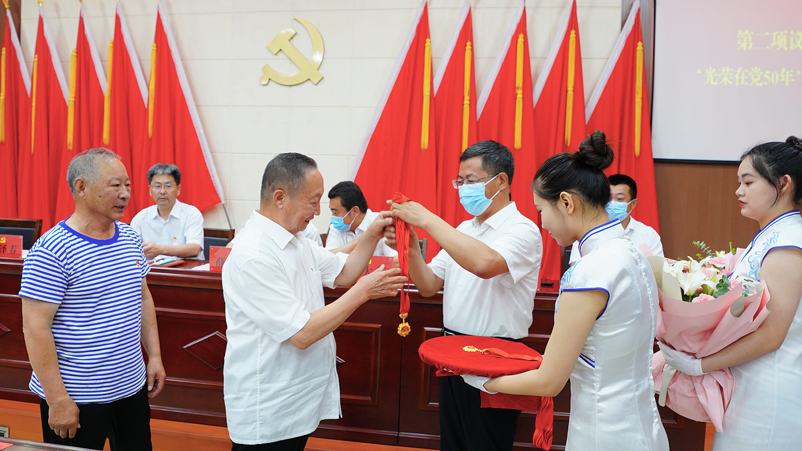 韩泽春为“光荣在党50年”老党员代表罗振民、温贵生颁发纪念章,并带领新党员代表入党宣誓、与会的其他党员重温入党誓词。党委副书记胡春香宣读《关于表彰优秀共产党员、优秀党务工作者和先进基层党组织的决定》。校党委班子成员为“两优一先”代表颁奖。